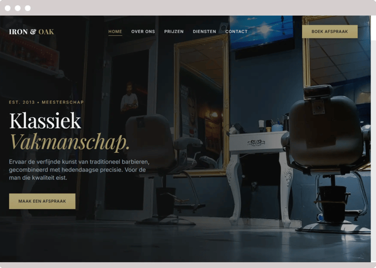 Een stijlvolle barbershopwebsite met sterke visuele uitstraling en duidelijke structuur. De focus ligt op sfeer, vakmanschap en overtuigende call-to-actions.